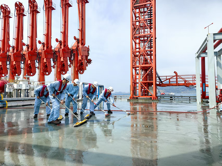 隱患排查小組深入碼頭各個角落,對設(shè)備設(shè)施進行“地毯式”檢查。他們仔細查看輸油臂、凸輪泵以及消防設(shè)施等,不放過任何細微之處。團員青年們憑借扎實專業(yè)知識,敏銳發(fā)現(xiàn)潛在安全隱患,并及時記錄匯報,為碼頭安全運營筑牢防線;衛(wèi)生清潔小組分工明確,有序清理碼頭垃圾與雜物。有的青年負責(zé)沖洗地面,有的用拖把掃把進行清潔。大家齊心協(xié)力,不怕臟累,經(jīng)過努力,碼頭環(huán)境煥然一新,為新春增添了一份整潔與清新。